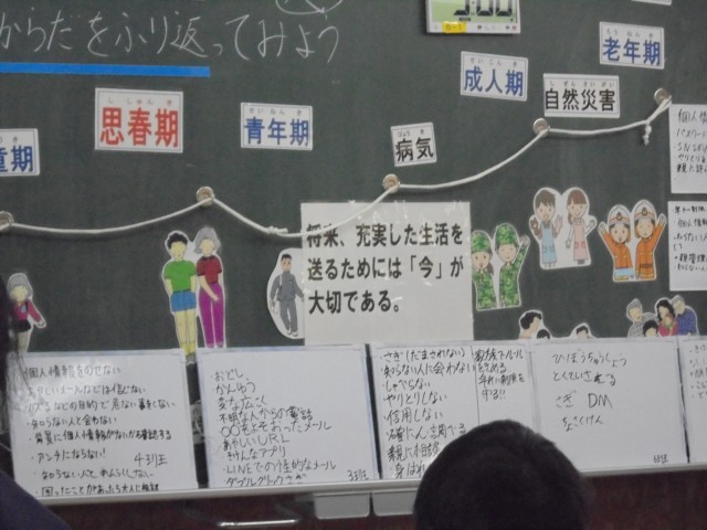 今日は6年生が学習していました。6年生は、これまで5年間学習してきたことを振り返り、この先の人生を生きていくためにはどんなことが大切かを考えました。人生がよりよく続いていってほしいけれど、残念ながらSNSなど悪い影響を受けてしまっている人が年々増えているという話から、そうならないためにはどうしたら良いかを話し合いました。その時々で、自他を大切にしっかり考えて行動することが大切だと確認しあいました。また、「小さいときは気にしなかったことも気にするようになった。」など、心の成長も改めて考えました。人生のどの部分においても、「今」を大切に生活することがその先の人生につながっていくことを学びました。
