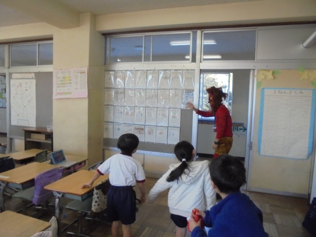 外の草花は、確実に大きくなっていて、春の訪れを少しずつ感じます。草花のたくましさにびっくりします。そして、朝、赤鬼が1年生教室に登場しました!「鬼は外ー!」子ども達に廊下に追い出された赤鬼さん。休み時間には外で鬼ごっこもしたとか…。最後は赤鬼さんと仲良く遊べたようです。