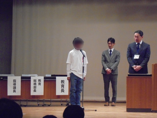 午後は、我孫子市の教育奨励賞授賞式がありました。今年度の活動で、全国、関東、県の様々な大会やコンクールなどで活躍した児童生徒に贈られます。今年、二小から、「千葉県防火・防災ポスター展」において最優秀賞に選ばれた3年生男子児童が選出され、立派に表彰を受けました。授賞の言葉では「はじめは絵を描くことに自信がなかったけれど、自信を持って描けるようになりました。これからも頑張ります。」としっかり言えました。教育長からもお褒めの言葉をいただきました。おめでとうございました!