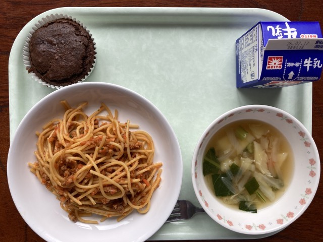 ミートスパゲティ ポテトスープ 米粉ココアケーキ