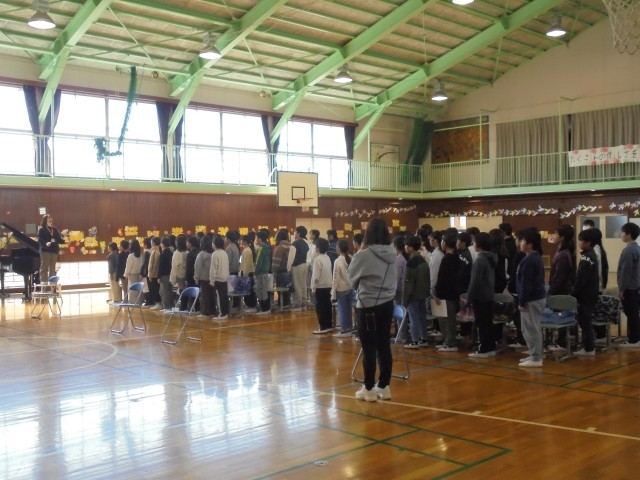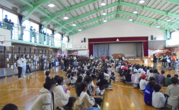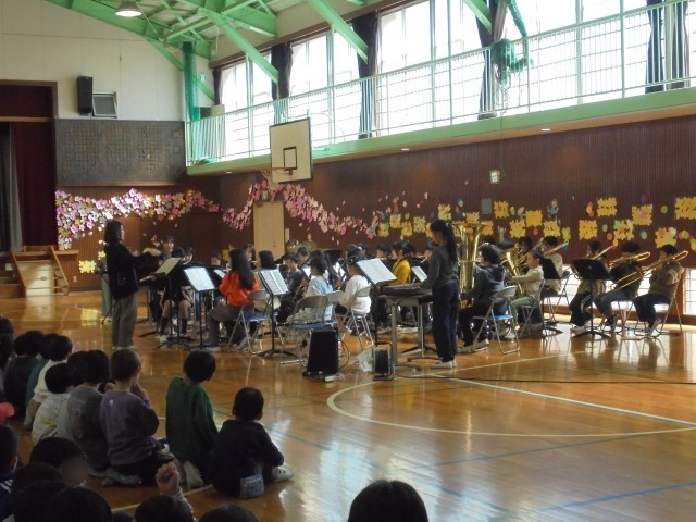 昼休みは、吹奏楽部が卒業コンサートを行い、「きらきら星」と「銀河鉄道999」を披露しました。大勢の子ども達や保護者の方も体育館に来てくださり、たくさんの人の前で発表することができました。最後は、見てくれた皆さんに全員で「ありがとうございました!」と挨拶をして6年生との部活動を締めくくりました。「市内音楽発表会での演奏から、さらに上達しましたね。」と言ってくださった保護者の方もいらっしゃいました。足を運んでくださった皆様、ありがとうございました。