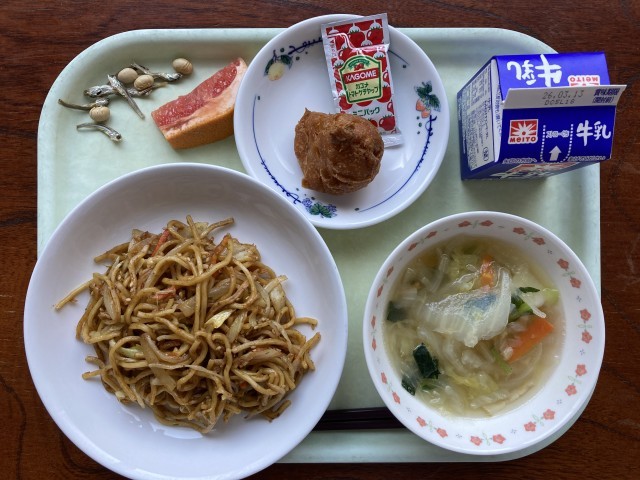 ソース焼きそば じゃがまるくん 白菜スープ いりこ大豆 グループフルーツ