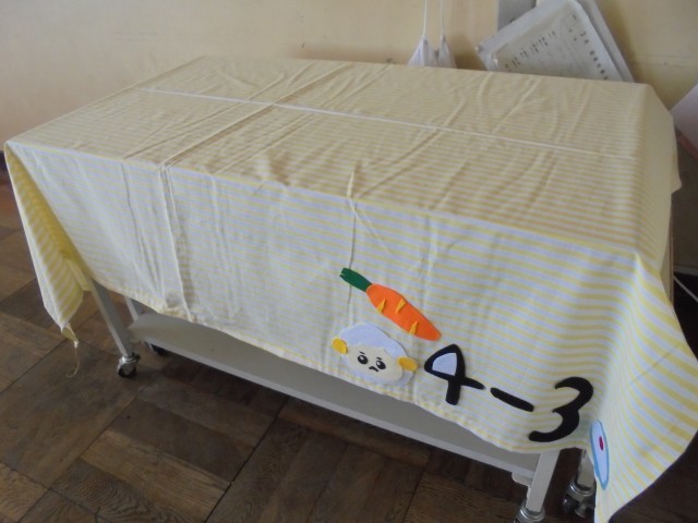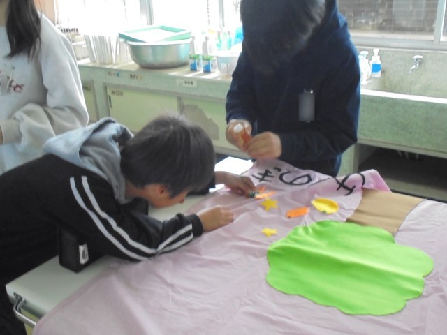 6年生は、全校への感謝の気持ちを込めた卒業制作として、全クラスの配膳台カバーを作りました。みんなが給食を楽しく過ごせるような、かわいいカバーです。この日の午前中まで頑張って作っていました。そして、給食の時間に各クラスへ贈呈しました。給食が終わって配膳台を片づけたら、さっそく各クラスでカバーをかけていました。このカバーを見る度に、6年生を思い出せますね。