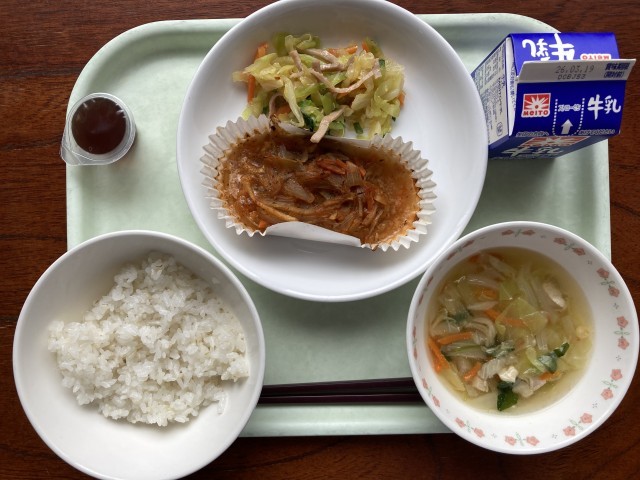 3月13日の給食 公開日 2026/03/16 更新日 2026/03/16 今日の給食 ◎献立麦ごはん たらのトマトソース焼き グリーンサラダ キャベツとコーンのスープ ひとくちぶどうゼリー 今日の給食