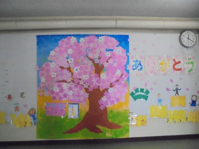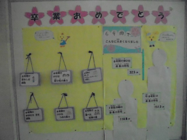 校内には卒業のお祝いや6年生へのエールを伝える掲示物がたくさんあります。保健室前には6年間でどれだけ成長したかがわかる掲示物が。6年間で伸びた身長の平均は32.5cm!子ども達が持っている30cmものさしよりもちょっと長いくらいです。改めて6年間てすごいですね!