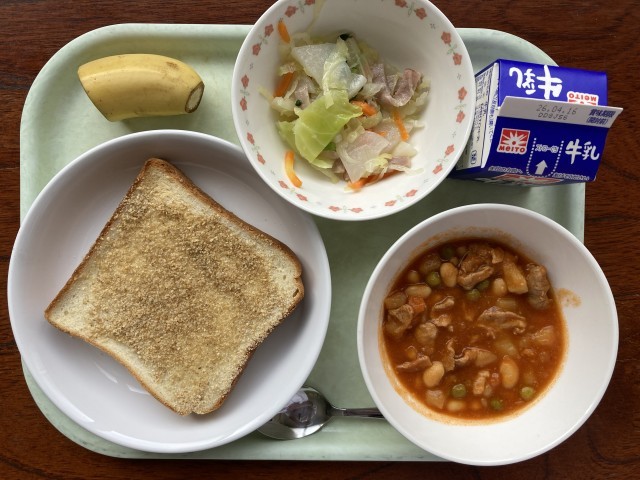 セサミトースト ポークビーンズ かぶのサラダ バナナ