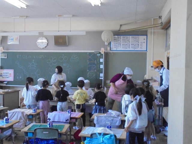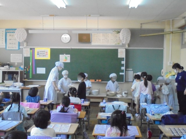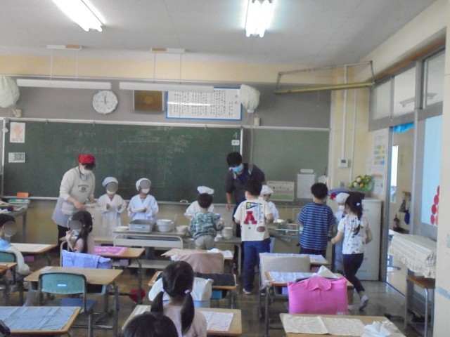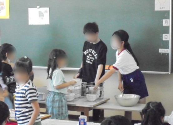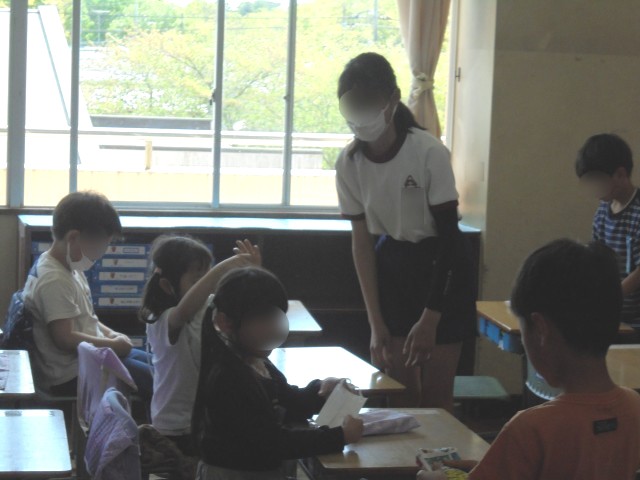 片付けの時は、6年生が手伝いに来てくれました。食器を片づけたり、机の上を片づけたりと、一緒にやってくれて安全にきれいに片づけることができました。1年生にとって6年生は頼れるスーパーマンのような存在です!
