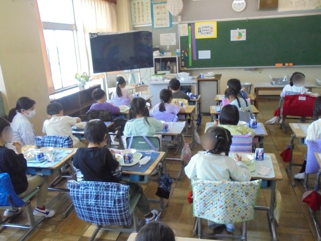 全員の用意が完了すると、「いただきます!」の挨拶をして食べました。「おいしいよ。」「これなら全部食べられる!」「おかわりしたい!」という声や、「残していいですか。」の声も。だんだん学校の給食に慣れていって、自分が食べられる量がわかったり、食べられるものが増えたりしていくと良いですね。初日のカレーはとても美味しかったですね!