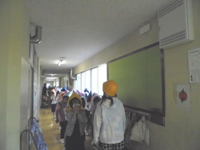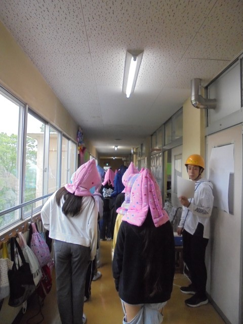 地震発生の音が鳴ると、まずは一次避難です。机の下にもぐって落下物から身を守ります。机が倒れないように机の脚をしっかり持ちます。揺れがおさまると、防災頭巾をかぶって待機の指示で静かに待ちます。その間に、学年主任の先生方は職員室で次の行動を確認しあって教室に戻ります。次の指示が出るまで、子ども達は誰もおしゃべりせずに待ちました。そして、火災の恐れが出たため二次避難ということで、今度は素早く並びます。先生の指示する声以外聞こえません。火が出たら煙を吸わないようにハンカチで口や鼻を押さえる子ども達。並べたら階段や廊下は落ち着いて、合い言葉の「おかしもち」を守って移動となるのですが、今日はここまで行いました。