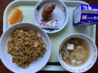 ◎献立ソース焼きそば じゃがまるくん 豆腐の中華スープ オレンジ
