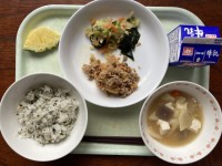 ◎献立わかめごはん 揚げ出し豆腐の肉みそあんかけ 和風サラダ 豚汁 パイナップル