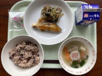 ◎献立麦ごはん 鰆の西京焼き 野菜と春雨の和え物 大根のみそ汁 パイナップル