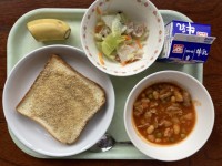 ◎献立セサミトースト ポークビーンズ かぶのサラダ バナナ