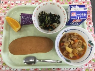 10月10日の給食 公開日 2025/10/10 更新日 2025/10/10 給食 (今日の献立)牛乳 コッペパン ブルーベリージャム ポークビーンズ ひじきのごまドレサラダ オレンジ 今日、10月10日は目の愛護デーです。それにちなみ、アントシアニンが豊富なブルーベリーのジャムを出しました。