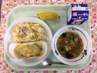 牛乳 カラフルピラフ 鰆の米粉クリームソース焼き 野菜スープ バナナ