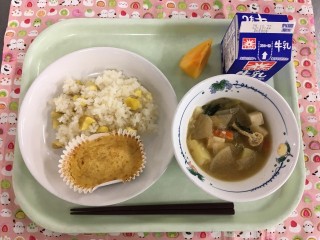 10月15日の給食 公開日 2025/10/15 更新日 2025/10/15 給食 (今日の献立)牛乳 栗ごはん 五目卵焼き お講汁 柿 今日は、香川県産の栗を使った栗ごはんです。秋の味覚を味わいました。