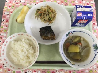 牛乳 ごはん さばのソース煮 野菜のごまあえ さつま汁 りんご