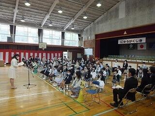 十分に換気をしても,蒸し暑い中での式となりましたが,1年生の子ども達は,とても立派な態度で参加をすることができました。呼名の返事も,とても上手にできました。しばらくは,分散登校になりますが,明日からの小学校生活が楽しみですね。