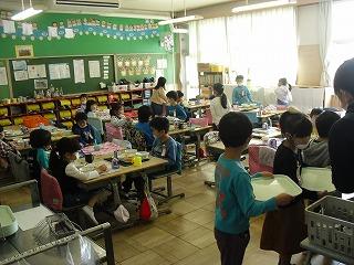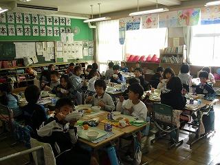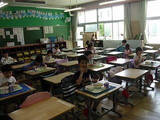 今日は,Bグループの1年生が初めての給食でした。昨日同様,先生の話をよく聞いて,上手に準備をして,ほとんどの児童が美味しく残さず食べることができました。