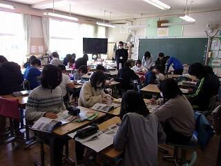 初めての彫刻刀に,みんな興味津々です。講師の先生から彫るポイントを教えてもらい,真剣に取り組んでいます。