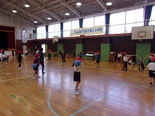 体育館では,4年生が跳び箱を頑張っていました。1年生は,昔遊びの練習です。