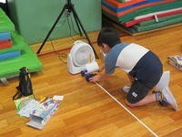 個々の実験結果は違ってはいたものの、ゴムを伸ばす長さとクルマの走る距離についての傾向をしっかりとつかんでいました。リーダーを中心に、データを読み上げたり、ホワイトボードにまとめたり、意見を言ったりしながら協力をして考察していました。ゴムを長く伸ばすと、クルマが遠くまで走ることが分かりました。 次の実験は、クルマに帆をつけて「風の力」を調べる実験です。教室に戻ってきたひまわり学級の子どもたちも、楽しそうに実験の考察について教えてくれました。