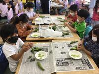 5月頃に植えた野菜たちが、夏の暑さにも負けずにグングンと大きく成長しています。ミニトマトが熟していたりキュウリが大きくなっていたり青々としたピーマンが大きくなったりとベランダが小さな農園のようです。毎朝欠かさず子どもたちは、大切に水遣りをしています。今日は、大きくなった実を食べる前にじっくりと観察する時間です。