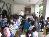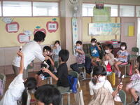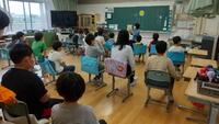 はじめの会をひまわり5組で行いました。例年は体育館で行っていましたが、6月の猛暑で急遽場所を変更し冷房の効く各教室が会場となりました。1階の4組と2階の5組から7組までを行ったり来たりしながら楽しみます。会が終わると、子どもたちは各教室へと移動しました。前半20分5分の休憩を挟んで後半20分の時間設定です。4組の教室では魚釣りが行われていました。