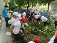 自分の鉢の前に行くと、真剣なまなざしで自分の野菜と向き合っていました。真っ赤になったミニトマトが早く食べてと言わんばかりにたわわに実っていました。スイカのような実も見られました。これからどんどん大きくなって収穫できる日が、待ちどおしいですね。愛情をいっぱい注いだ野菜は、きっと美味しいと思います。