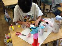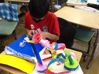 3年生のクラスでは、厚紙とダンボールのような曲げられる紙、薄い色のついた紙を使ってステンドグラスのような作品作りをしていました。