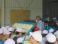 精米所に案内されました。もみ殻のついたお米からもみ殻を取ると玄米が現れます。玄米をさらに精米機にかけると白いお米(精白米)が出来上がります。精米をする際に米ぬかが出来上がるそうです。もみ殻と米ぬかを混ぜて野菜畑の肥料にするそうです。子どもたちも熱心にメモを取っていました。