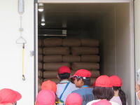 30キロ入りの米袋も、最近は重いので半分の15キロや10キロに小分けしたりもするようです。重い米袋を何回も運ぶのは大変な作業なので、写真のような機械が使われていました。お米の冷蔵庫は、常に13℃前後に保たれていてお米の品質維持には欠かせないもののようです。最後まで一生懸命にお米の説明を聞いていました。