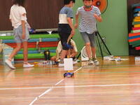 体育館に行くと実験の準備をしていました。友だちと協力しながら、クルマのは走らせ方の確認をしていました。準備ができた人から実験のスタート。まずは、ゴムの長さが5cmから少しずつ伸ばしていきます。みんな準備が整いいよいよ実験開始です。