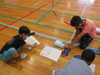 中央に一列コーンポストを並べてメジャーが貼ってあります。自分のクルマの位置とメジャーを見比べて距離をノートにメモしていました。クルマによって走る距離は多少違いましたが、ゴムを伸ばす長さを増やしていくとクルマが遠くまで走っていくことが分かりました。ひまわり学級の3年生も、楽しく学習していました。