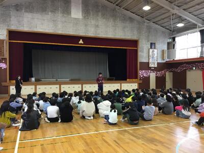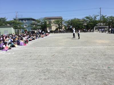 そして、学校生活担当の先生からは、「たくさん挨拶をしましょう。挨拶には、いろいろな種類があります。どの挨拶も、するとよいことがたくさんあります。気持ちがすっきりし、友達と仲良くでき、笑顔になれます。だれにでも進んでたくさん挨拶をしましょう。そして、三小が笑顔であふれる学校になるといいですね。」というお話がありました。