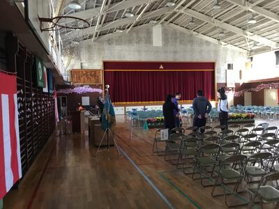 入学式の実施にあたっては、三小の職員が力を合わせて準備を進めてきました。そして、当日の朝も、職員は式場の最終確認や清掃を行いました。このような、見えにくい場所でも子供たちのために力を合わせられる職員が、三小の自慢です。そして、綺麗に整えられた式場に、新1年生の子供たちと保護者の皆さんをお迎えしました。