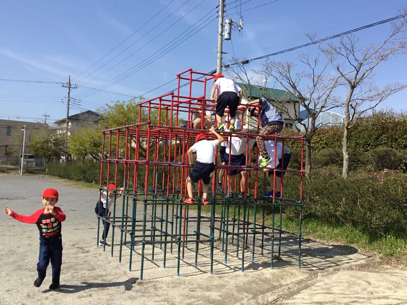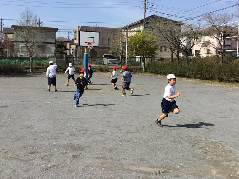 外に出ると、ランニングをして、サーキット運動。ジャングルジムを登ったり、砂場を駆け抜けたり、タイヤの間をジグザグ走り・・・。