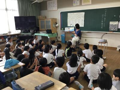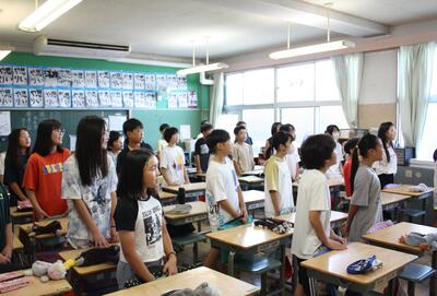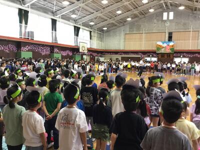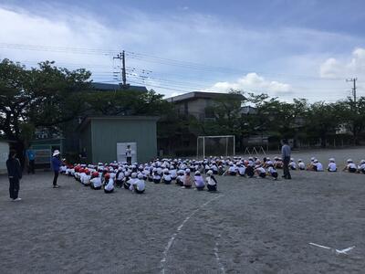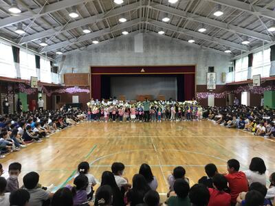 生活担当の先生からは、「なつやすみ」にちなんで「夏休みを楽しく過ごそう」「ついていかない、知らない人に」「やるぞ!勉強、お手伝い」「水分補給をしよう」「みんなそろって楽しい夏休みを過ごし、2学期に元気に会いましょう」という話がありました。