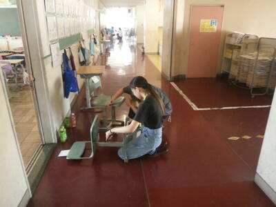 また、大学生ボランティアの方は、放課後も大活躍です。各学級の机と椅子の高さ調整をしてくれました。机や椅子の高さが身長に合わないと、学習に集中できないことがあります。高学年なら、児童が自分でねじを使って回せますが、低学年だとそれも難しいです。今回は、ボランティアの方が中心となって全学級の作業を手伝ってくれました!