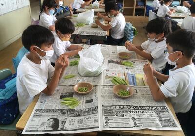 食育の一環で、一年生が「そら豆のさやむき」をしました。