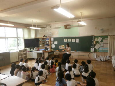 図書委員会の児童が読み語りを行い、多くの児童がお話に夢中な様子でした。