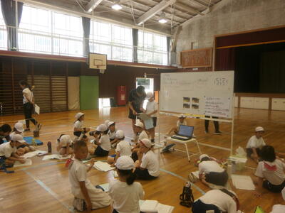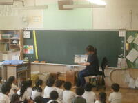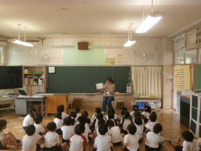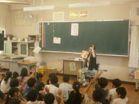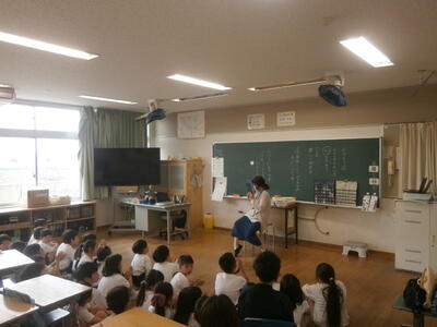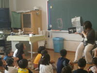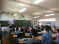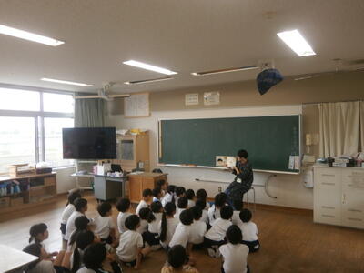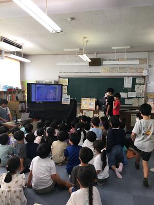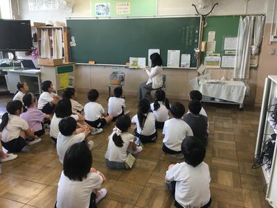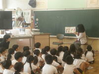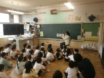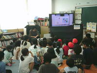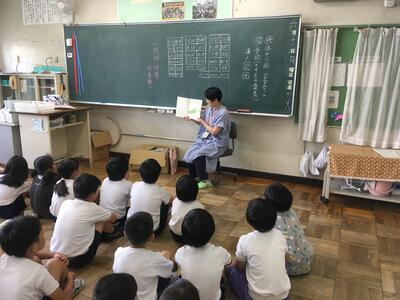 まずは、「ひょうたんから本°」の読み聞かせ活動で、1,2年生に読み聞かせをしていただきました。1年生も2年生も、真剣に聞いて本の世界に入り込んでいるようでした。
