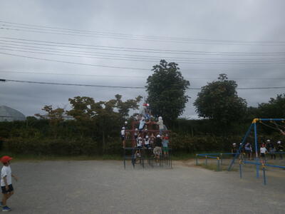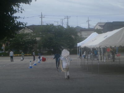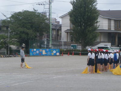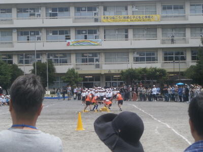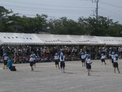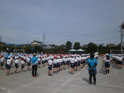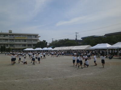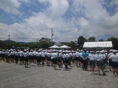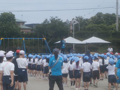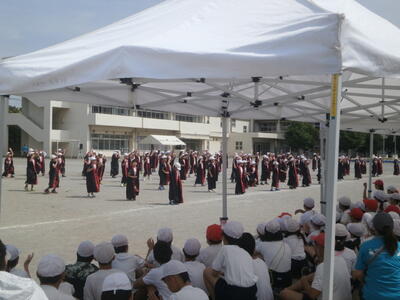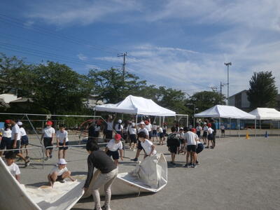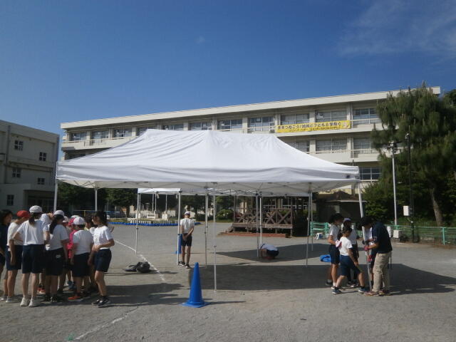 全校児童が校庭に集まるということは、熱中症対策が不可欠です。1つの取り組みを新たに実施するということは、必要な配慮が増えるということです。今日は、たくさんのテントを校庭に組む必要がありました。