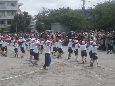 6年生は、裸足で表現運動の練習をしていました。指導にあたる担任の先生も、また裸足でした。先生たちも、子供たちと一緒に足を汚して、汗をかいて、共に成果を喜びあっています。