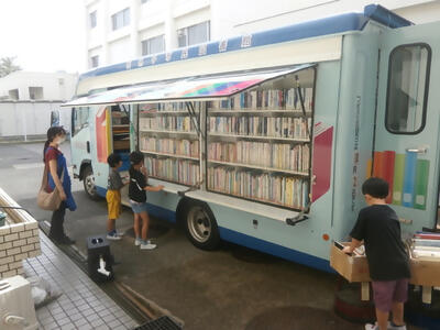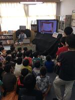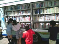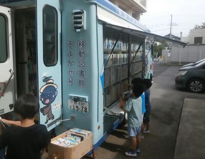 毎週木曜日のおはなし会(先生方も行っています)、毎月行われるそよかぜ号による本の貸し出し。