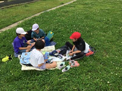 今日は比較的涼しいですが、最近は日差しが強かったり湿気が多かったりして蒸し暑い日も増えてきています。そのため、指数に基づいた運動制限を行ったり、こまめな水分補給の時間や休憩時間を確保したり、エアコンを効果的に活用したりして、子供たちの熱中症を予防しながら練習を続けます。
