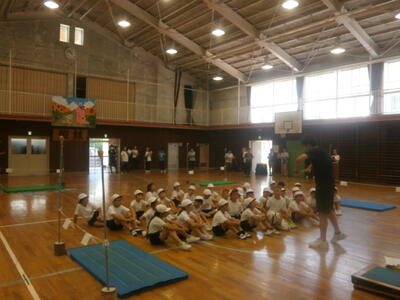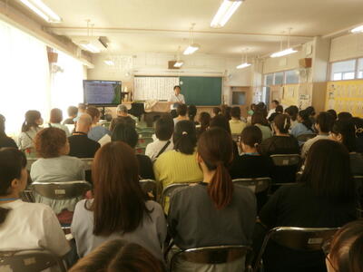 三小の児童が、明るくいきいき体育の学習に取り組めるように、予備的運動についての指導方法を、実際の動画を見ながら学びました。