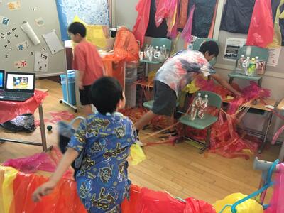 最初は、どうなることか不安だったのですが、6年生が手伝ってくれたため、不安は安心に変わりました。6年生たちは、掛け声とともに体育倉庫に走りこんできて、その流れで重いテントの骨組みや梁を一斉に運んでいきました。そして、気づくと設営のフォーメーションが出来上がり、あれよあれよの間に、テントが端から順に上がっていきました。テント設営の最中には、「任せてください!」「やりますよ!」「これを運べばいいのですね!」「もっとやっていいですか!」という、前向きなエネルギーあふれる声が飛び交いました。また、子供たちは皆、笑顔でした!