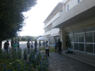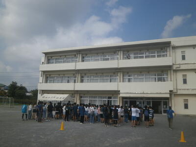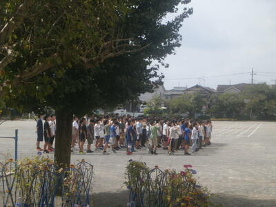 放送の合図で机の下にもぐり、地震がおさまった後に担任の先生の指示で校庭に集合し、全校児童の安全確認後、校長先生や安全担当の先生の話を聞くという流れで行いました。