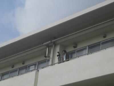 校庭では、6年生が全員集合し、全体集合写真を撮影していました。撮影の方法は、第3校舎の3階ベランダからカメラマンさんが子供たちの様子を撮るやり方です。この方法は、昨年度の75周年記念行事で全校写真を撮った時と同じなので、子供たちには馴染み深かったようです。